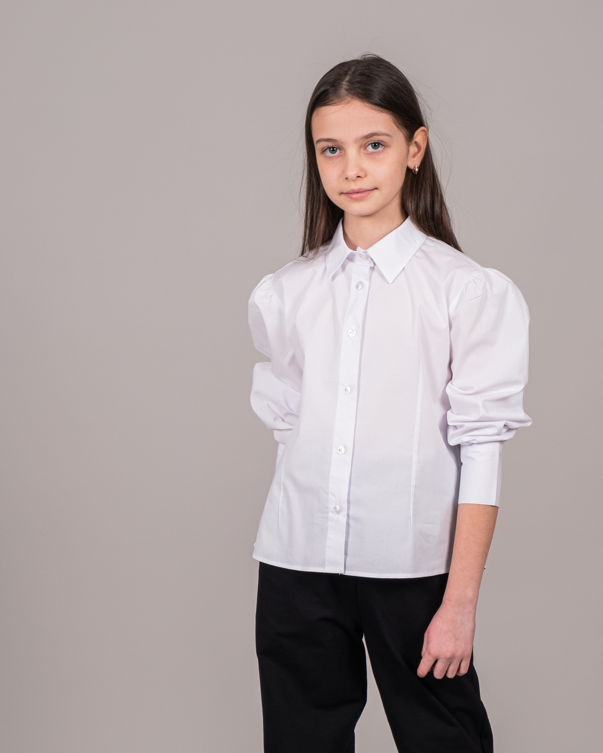 Белая блузка-рубашка с отложным воротничком - это классический вариант для девичьей школьной формы и торжественных мероприятий. Длинные рукава на манжетах с пуговицами. Воротник отложной. Блузка изготовлена из тонкого полотна на хлопковой основе, очень приятного телу. Она хорошо держит форму при активной носке и не теряет ее после многократных стирок. В такой милой блузке вашему ребенку будет очень комфортно на уроках в школе и торжественных мероприятиях.