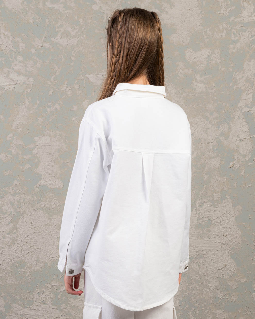 Рубашка DMB для девочки оптом. Это универсальная одежда на любой сезон. Удлиненный крой, отложенный воротник и карманы придают ей стиль и особый шарм. Рубашка для девочки выполнена из 100% хлопка (габардин).