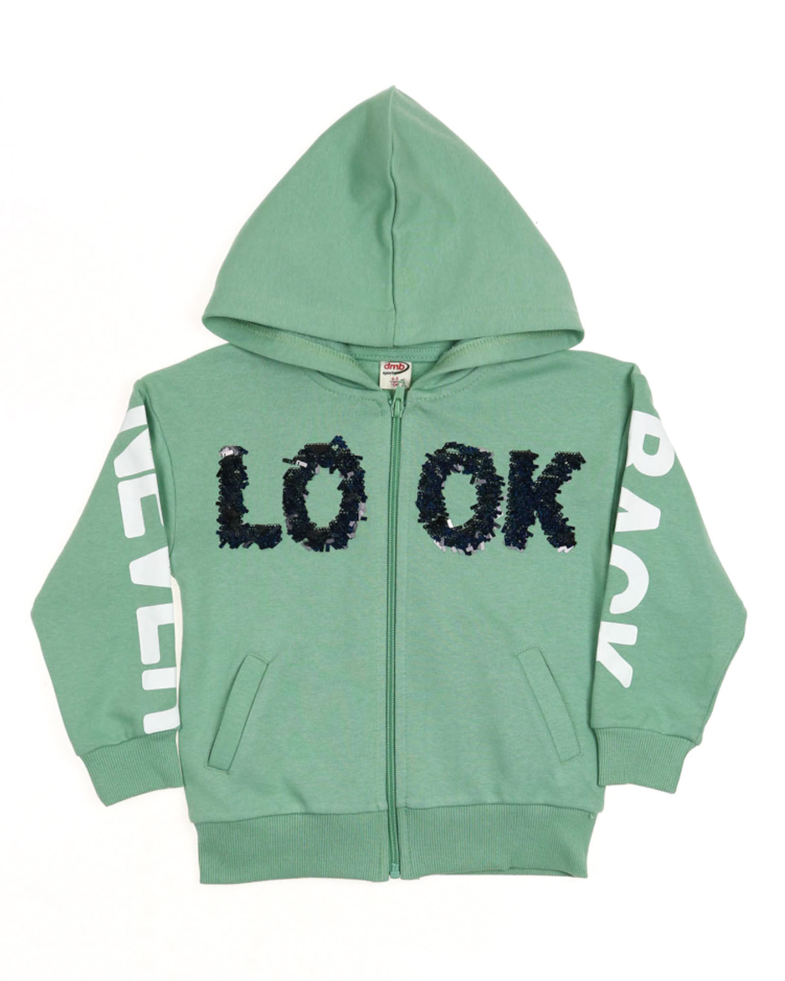 Стильный спортивный костюм для девочки выполнен из трикотажа футер (петля). Толстовка на молниии с капюшоном. На груди аппликация из пайеток. Брюки умеренного объема зауженные к низу.