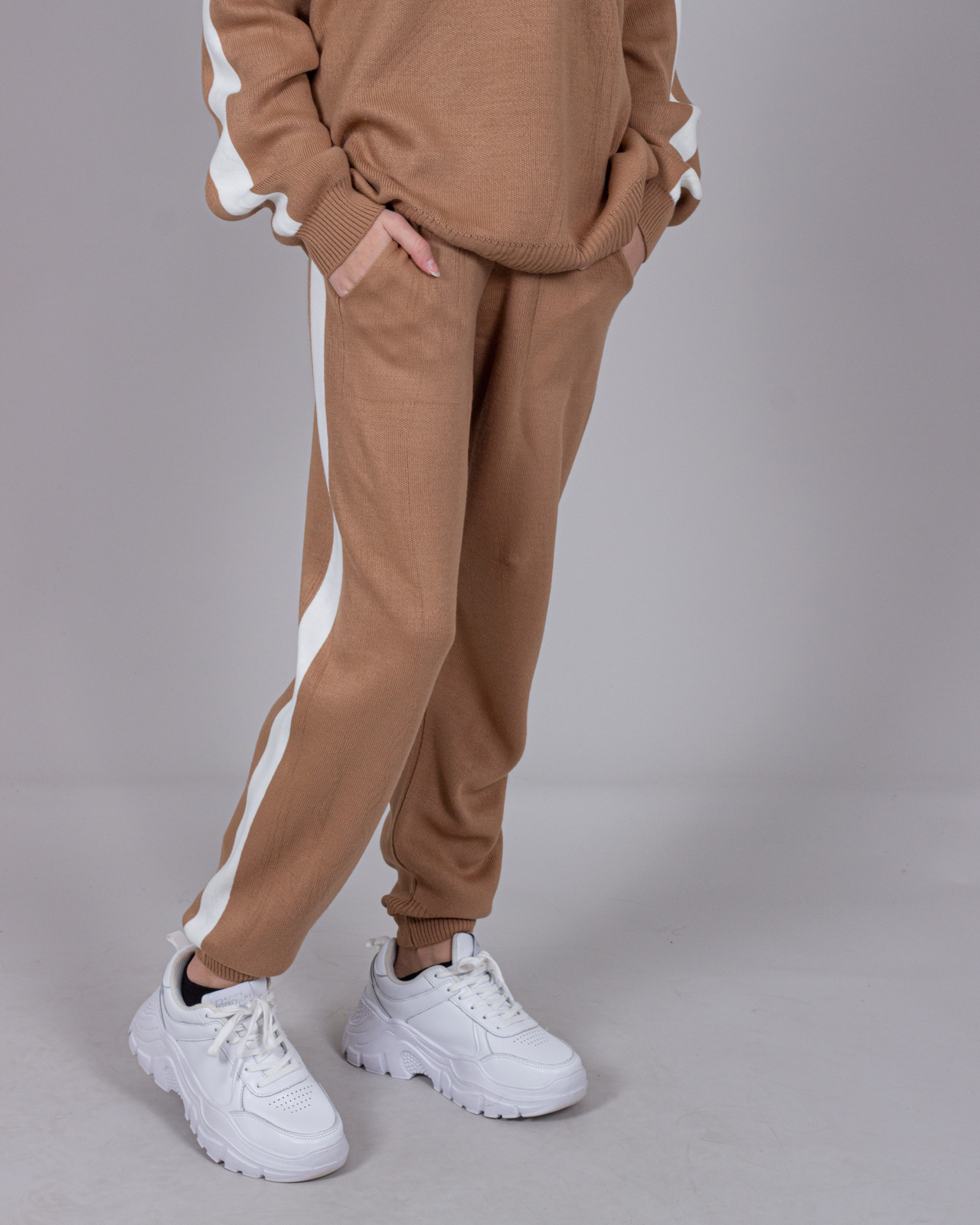 Трикотажный костюм для повседневной жизни выполнен из качественной турецкой пряжи. Костюм смотрится элегантно и стильно, отлично подходит для дома и отдыха.