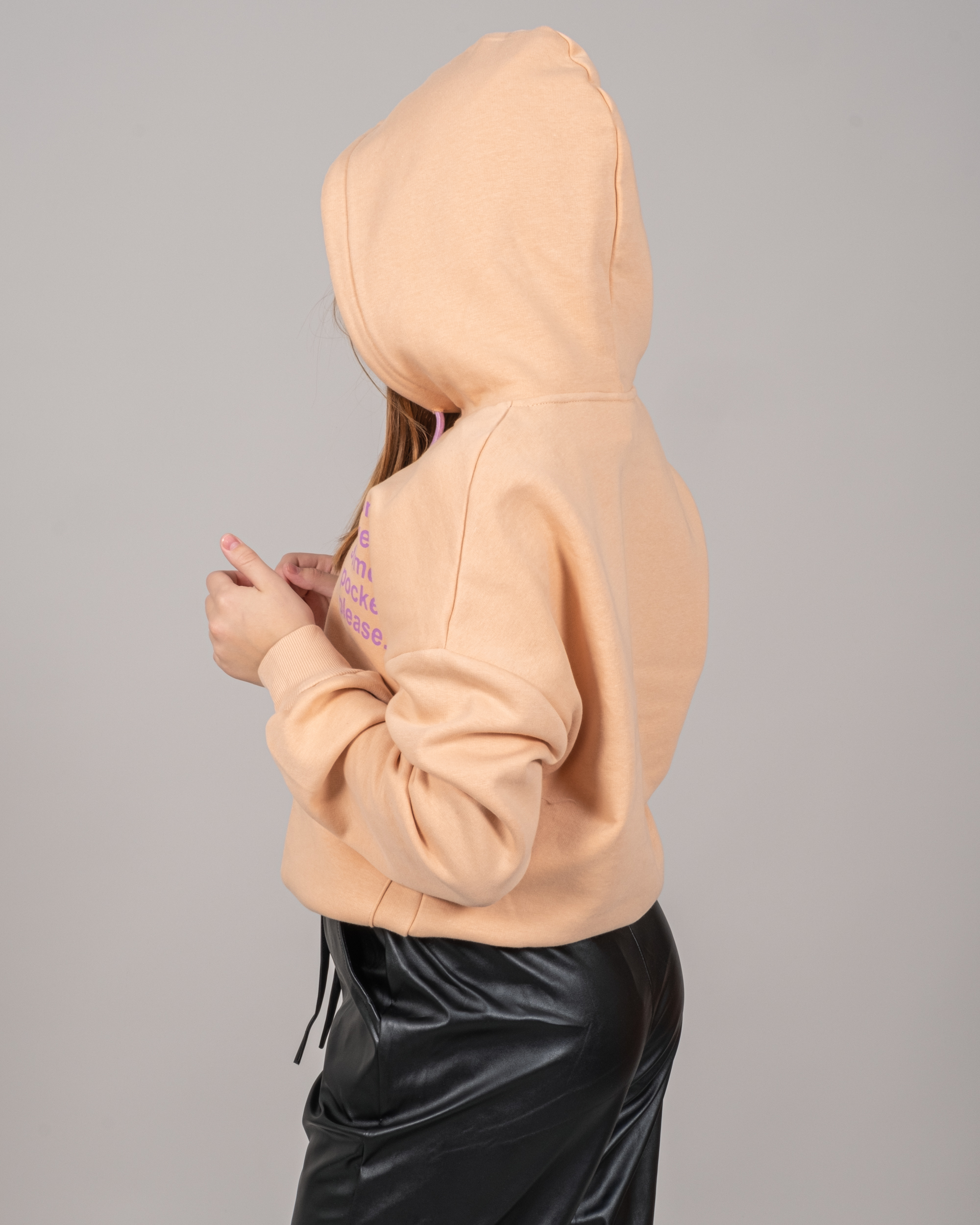 Худи  выполнено из трикотажа футер (начес). Модель умеренной длины, двойным капюшоном и накладным карманом на талии.