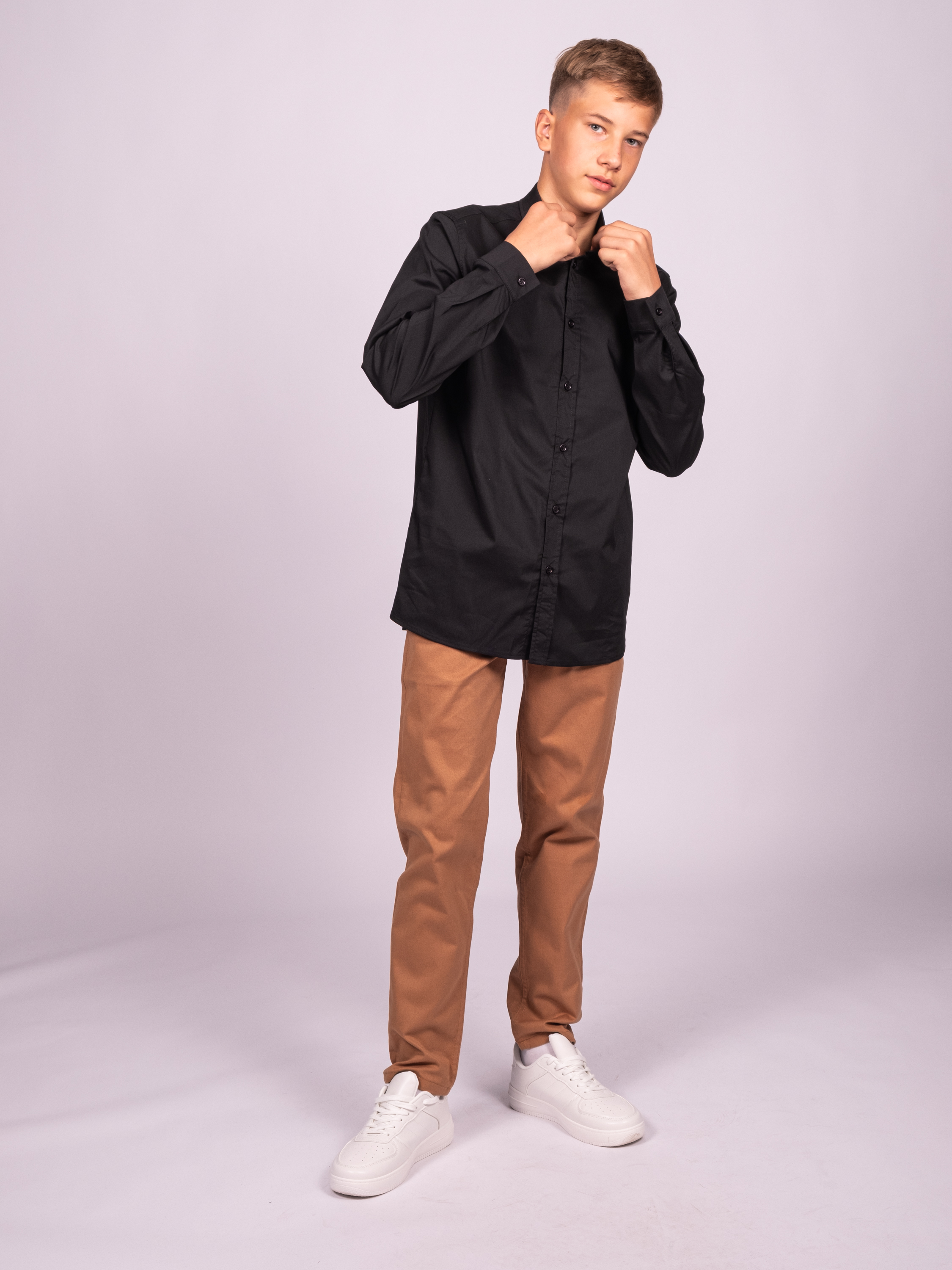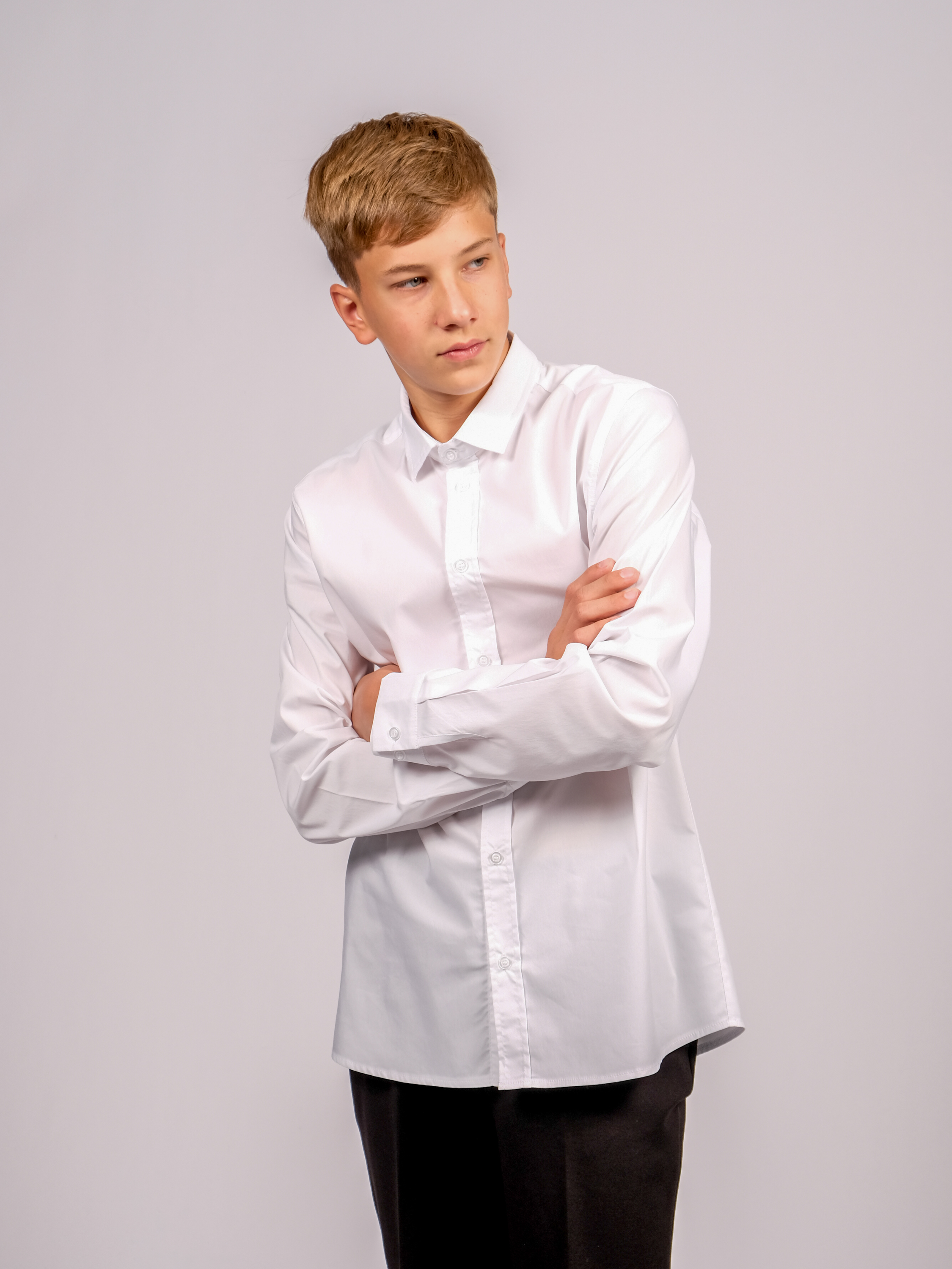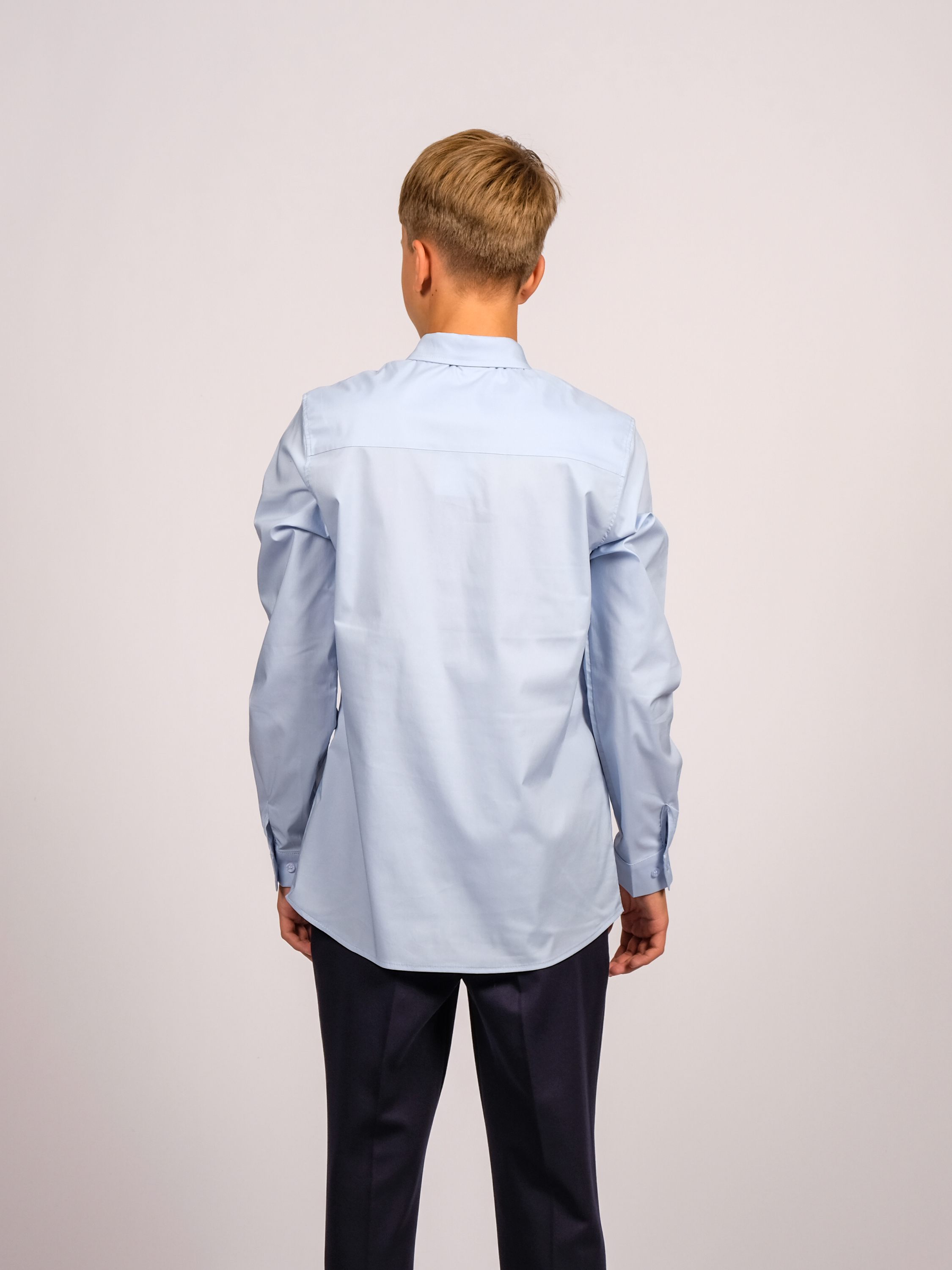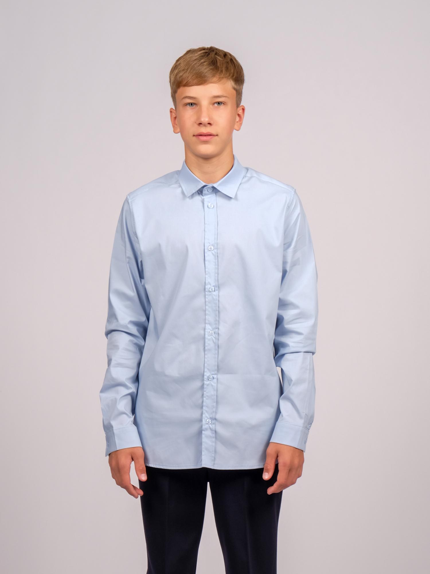 Оптовая продажа однотонных школьных рубашек для мальчиков. Изделие выполнено из высококачественной ткани с добавлением смесовых волокон. Рубашка оснащена пуговицами для застегивания и имеет приталенный крой.