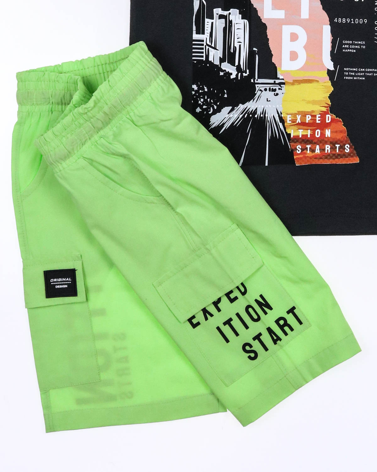 Костюм для мальчика DMB оптом. Футболка прямого кроя с короткими рукавами. Бриджи с карманами на эластичном поясе с кулиской, сшиты из хлопка.
