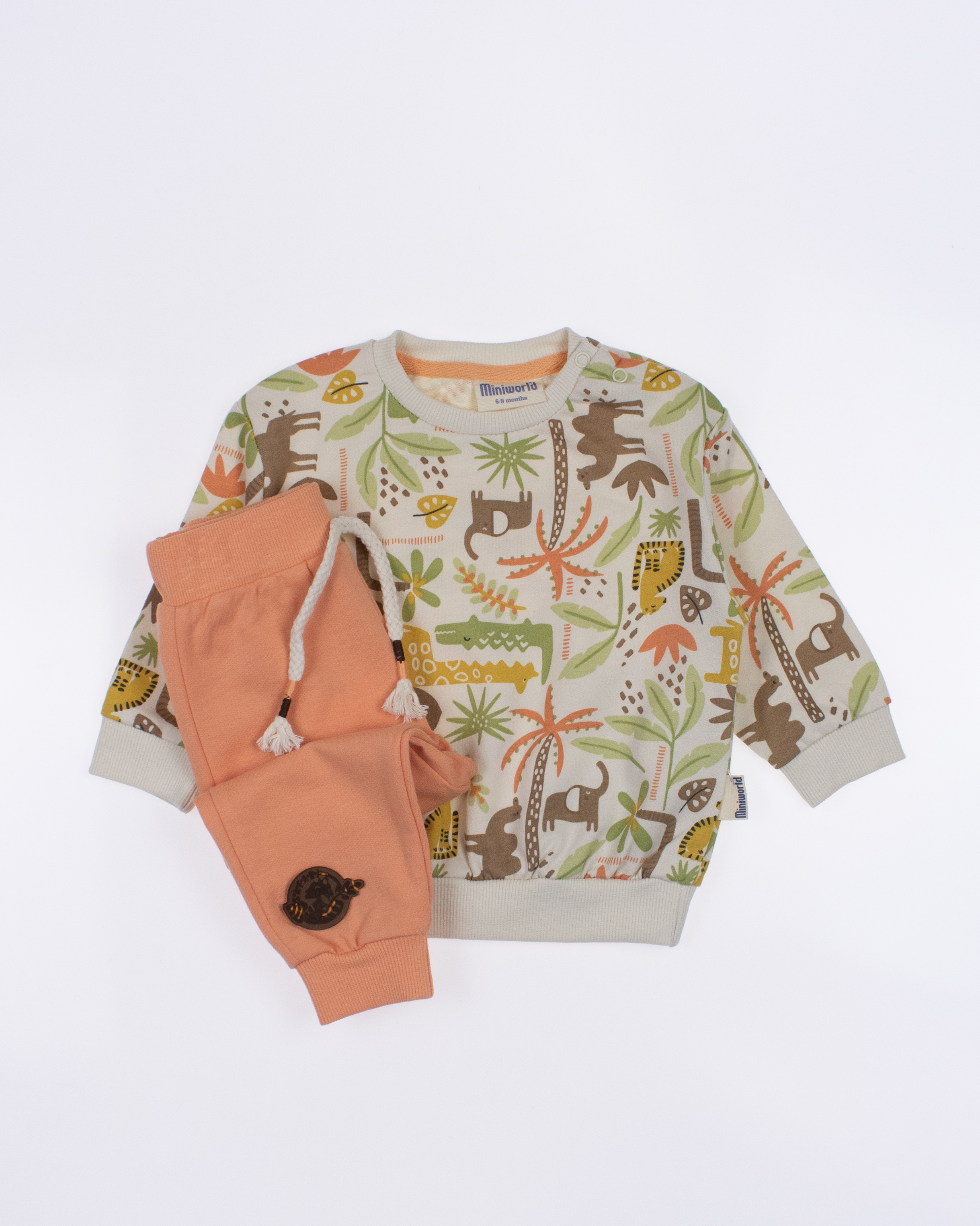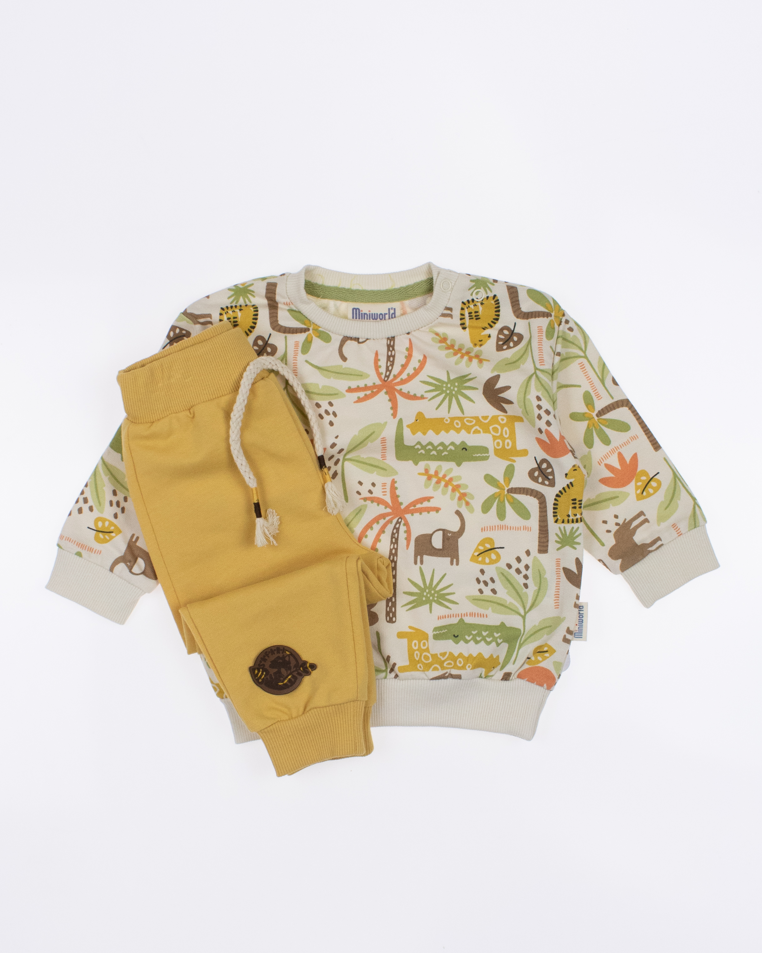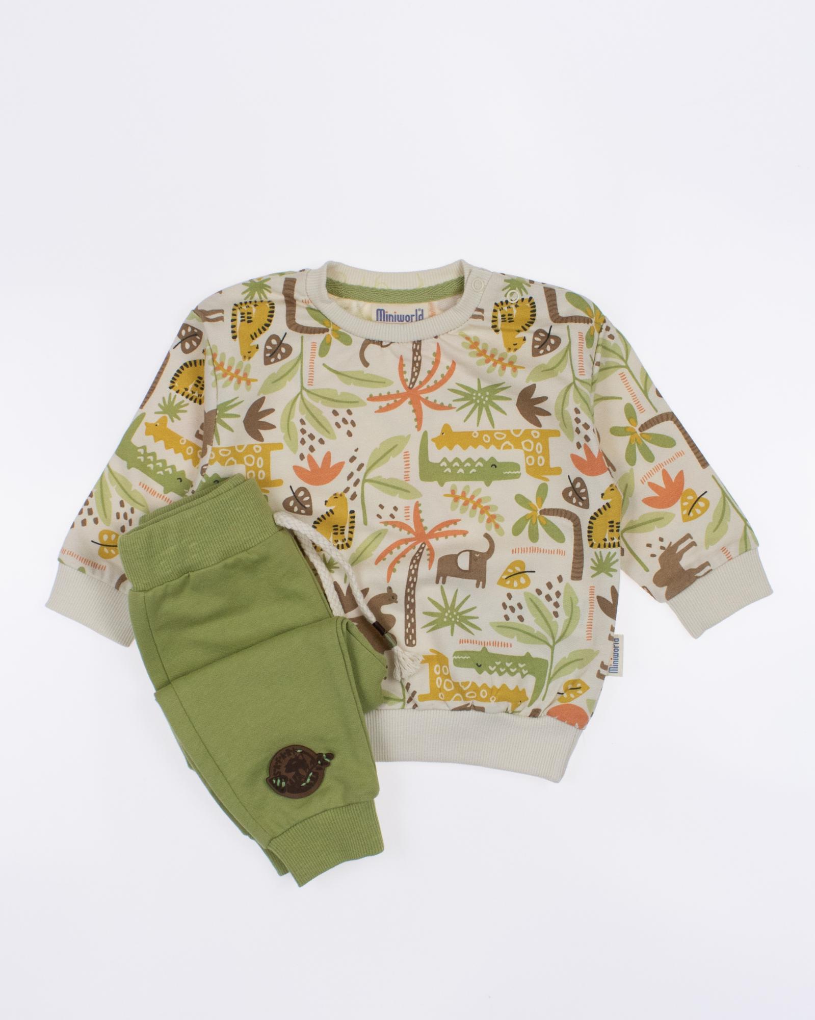 Мы предлагаем оптовые продажи детской одежды производства Турция. Хлопковый костюм  MINIWORLD выполнен из 100% хлопка, что гарантирует комфорт и безопасность для самых маленьких детей. Свитшот имеет удобную застежку-кнопки на плече, что облегчит процесс надевания и снятия одежды. Штанишки с мягкими манжетами на эластичном поясе идеально подходят для ношения с подгузником, обеспечивая свободу движений и комфорт. Детский милый принт на костюме поможет развить фантазию и воображение ребенка, делая его образ ярким и запоминающимся. Костюм MINIWORLD - отличный выбор для маленьких модников и их заботливых родителей. Не упустите возможность приобрести этот уникальный товар оптом по выгодной цене!