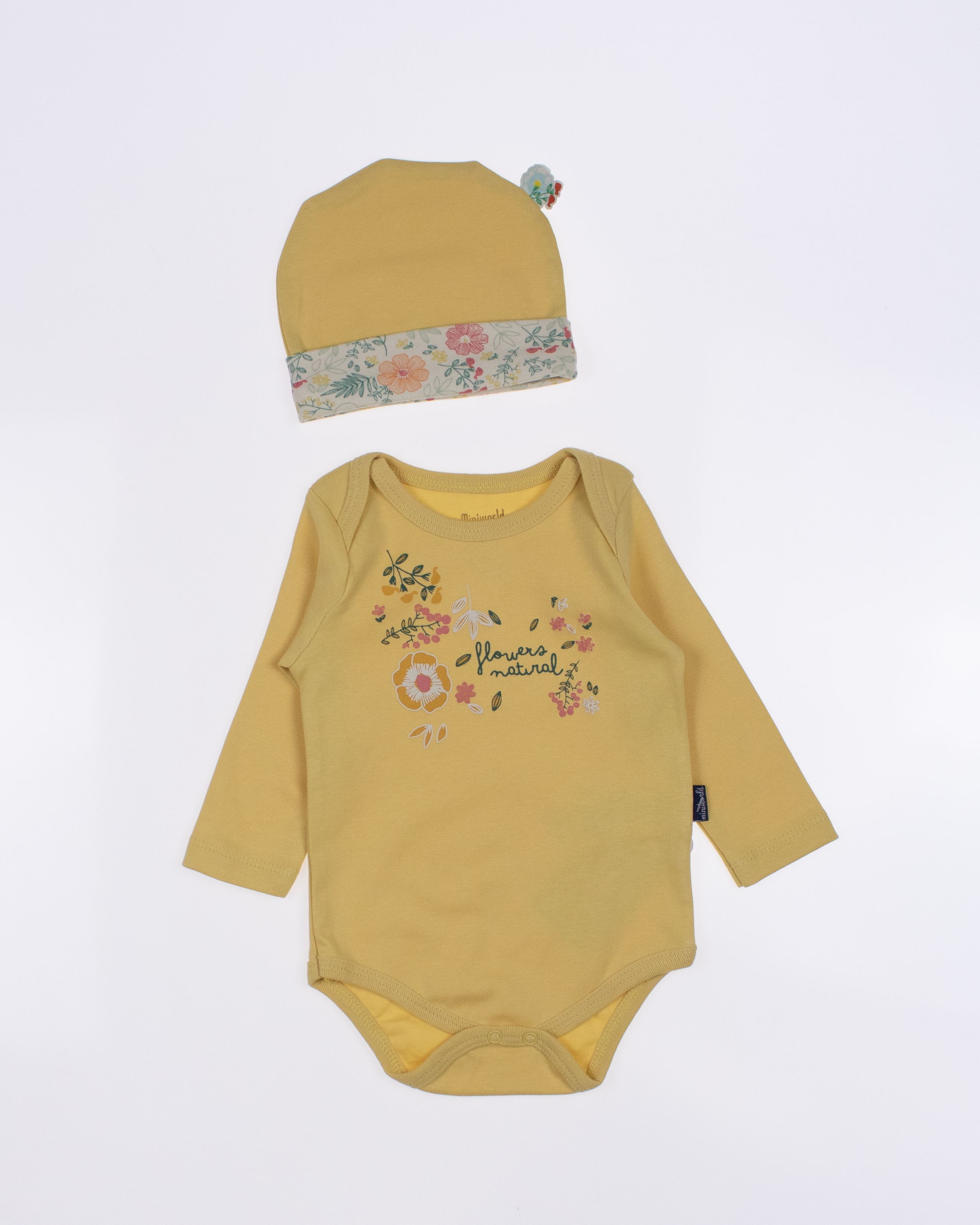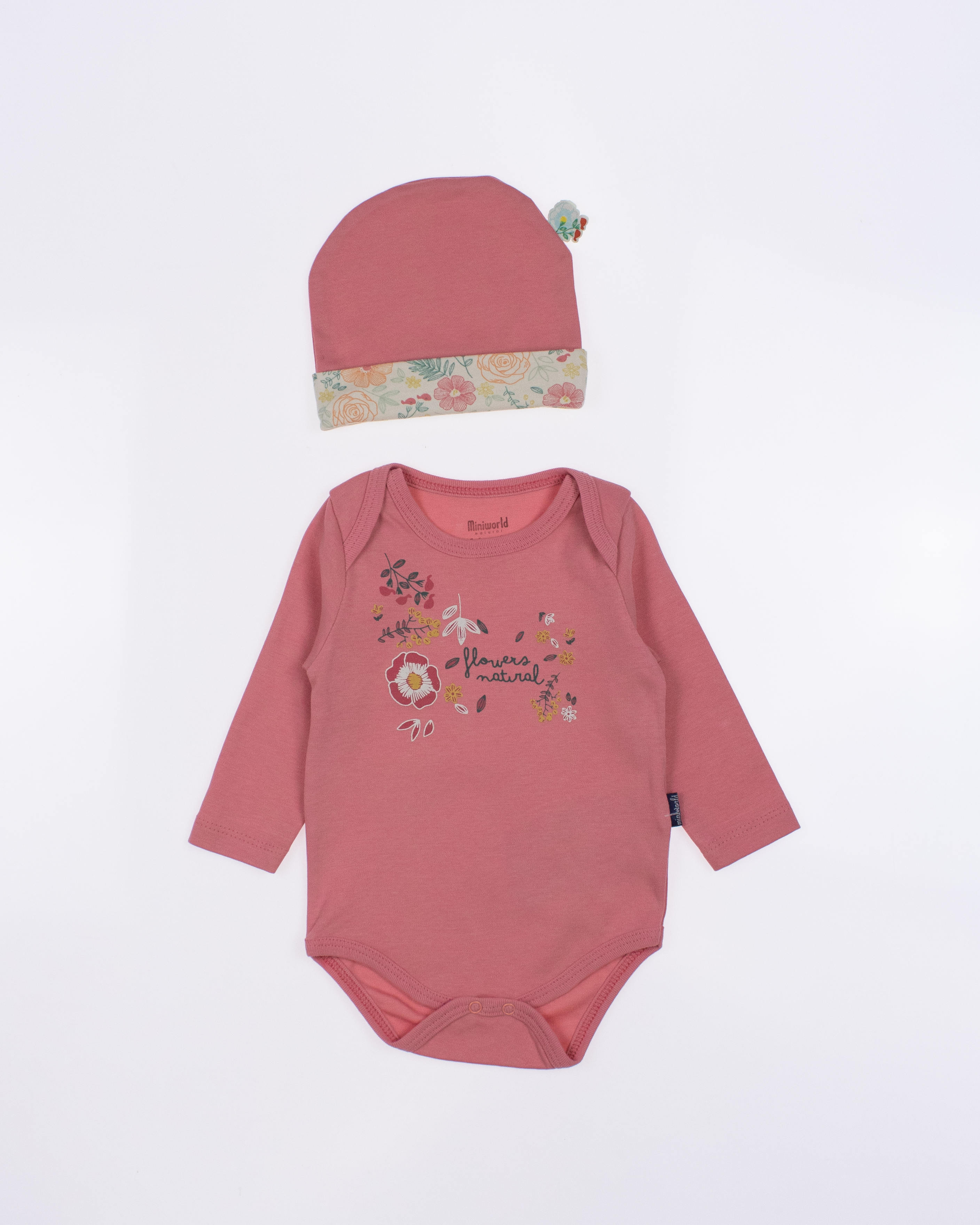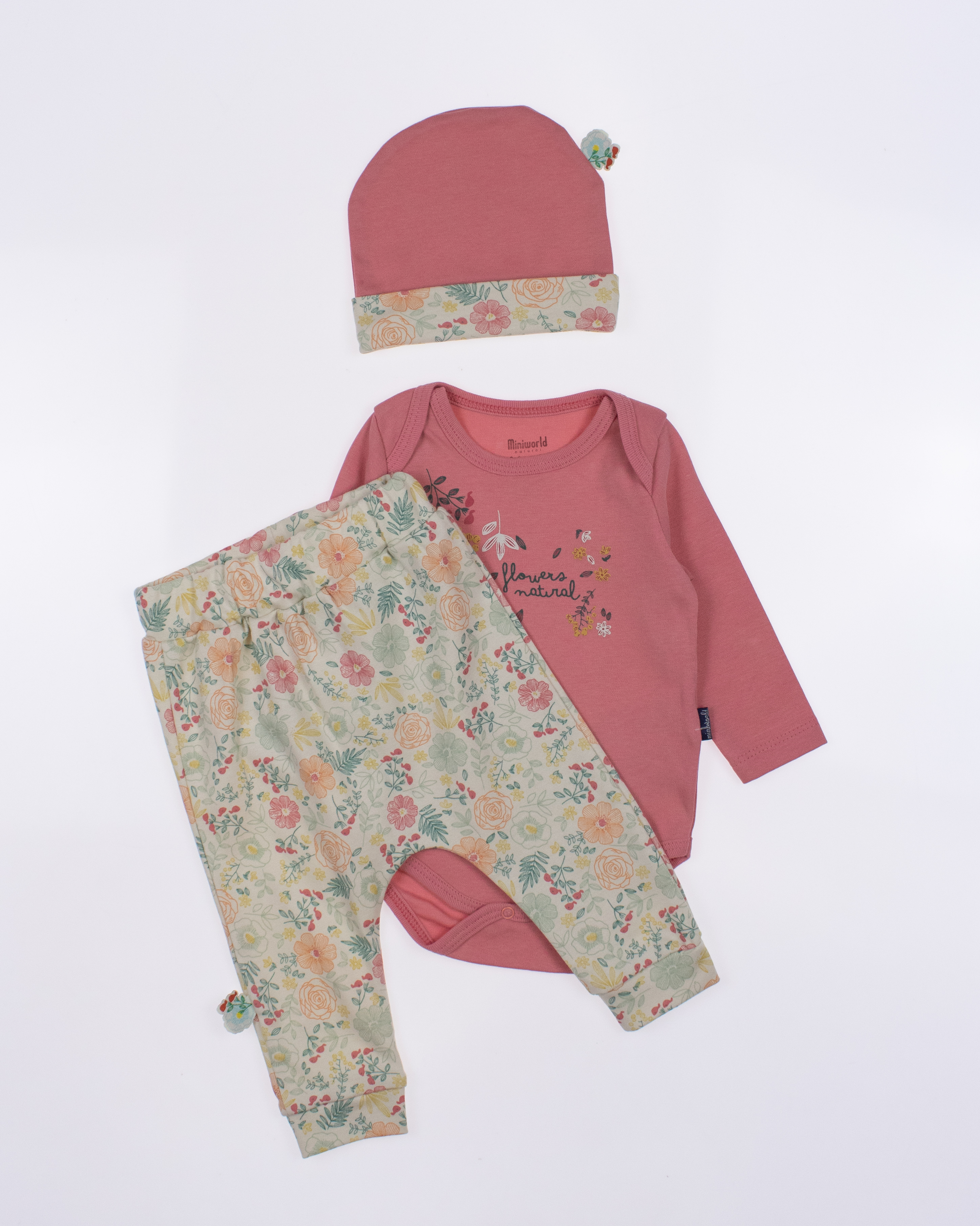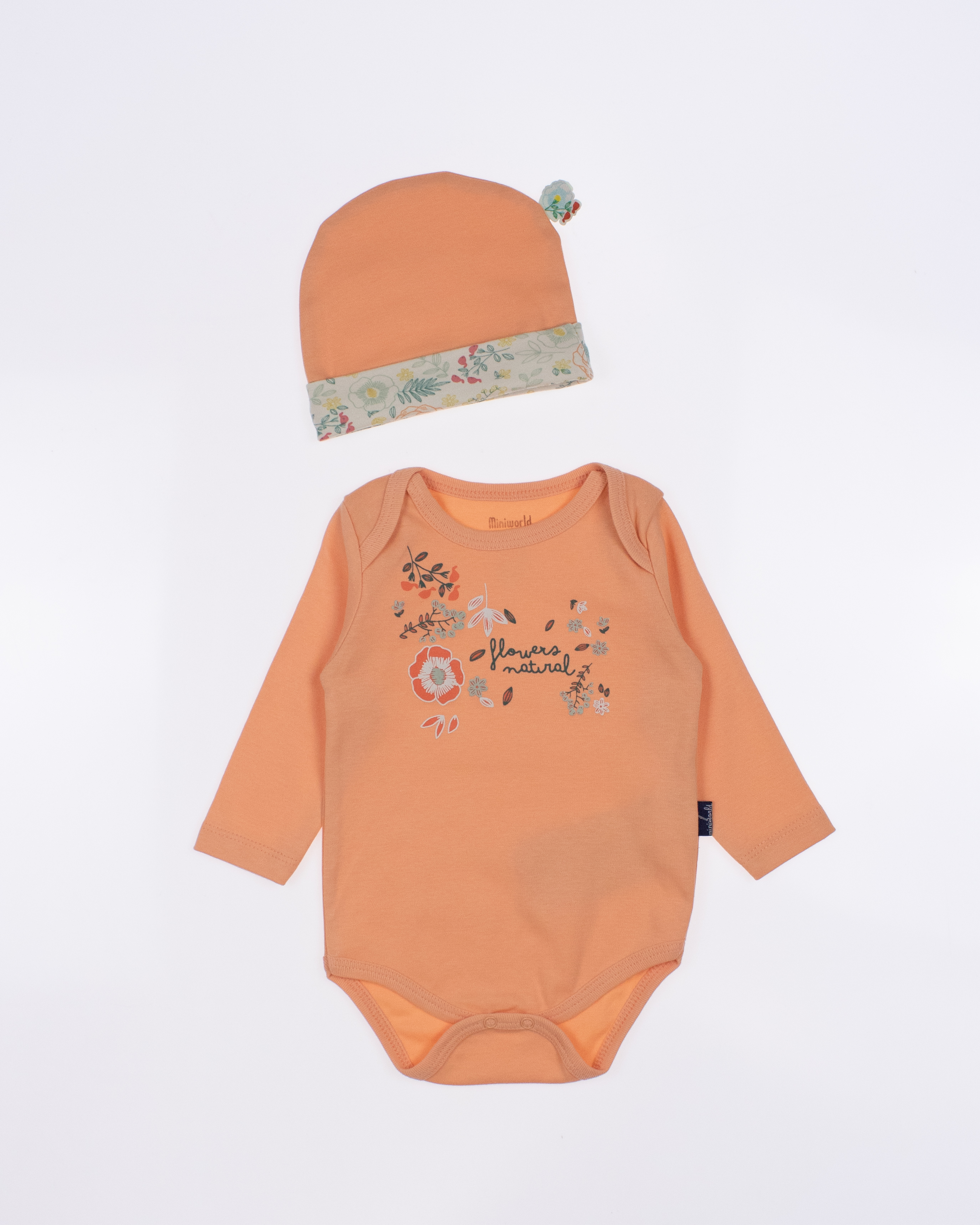 Детский боди MINIWORLD с длинным рукавом, штанишки и шапочка - комплект, который подойдет малышам с самых первых дней жизни. Боди для новорожденного очень удобен, снизу оснащён кнопками, благодаря которым маме будет удобно в любое время менять памперс ребенку.