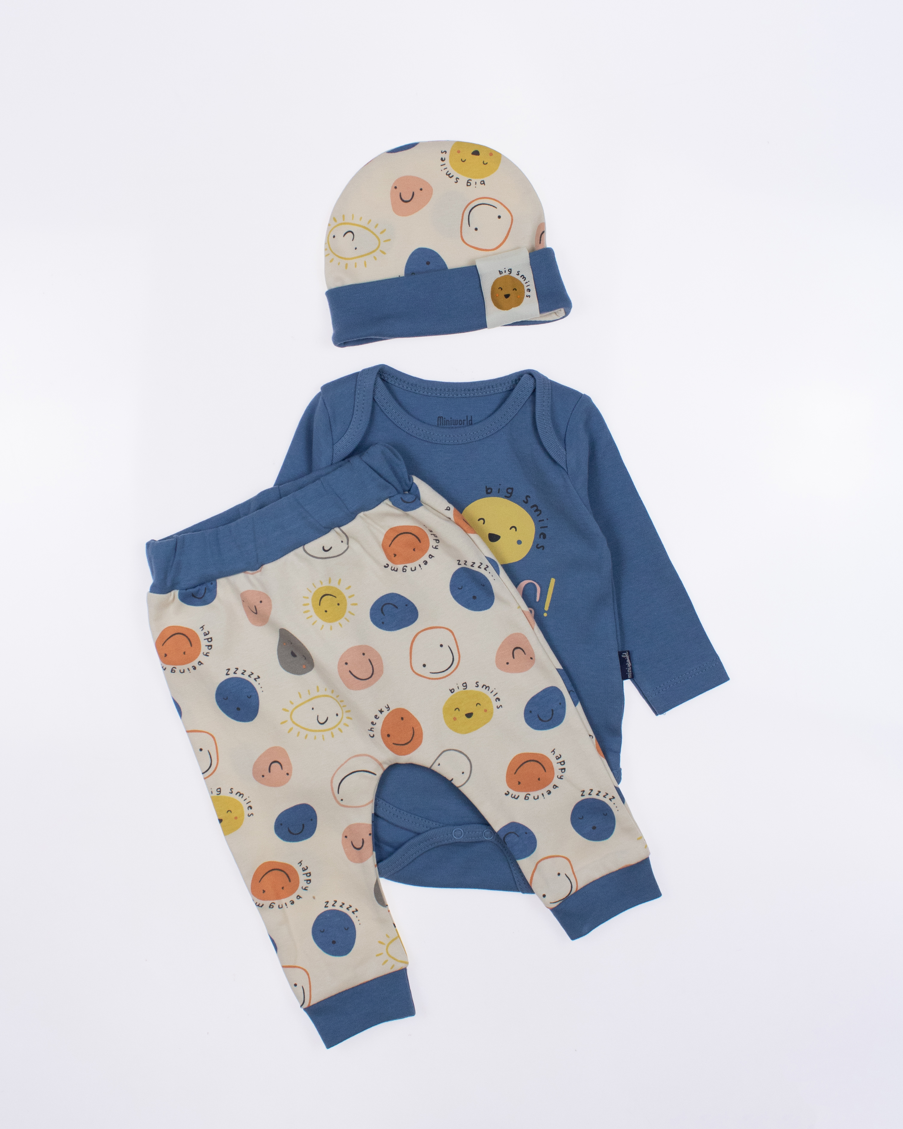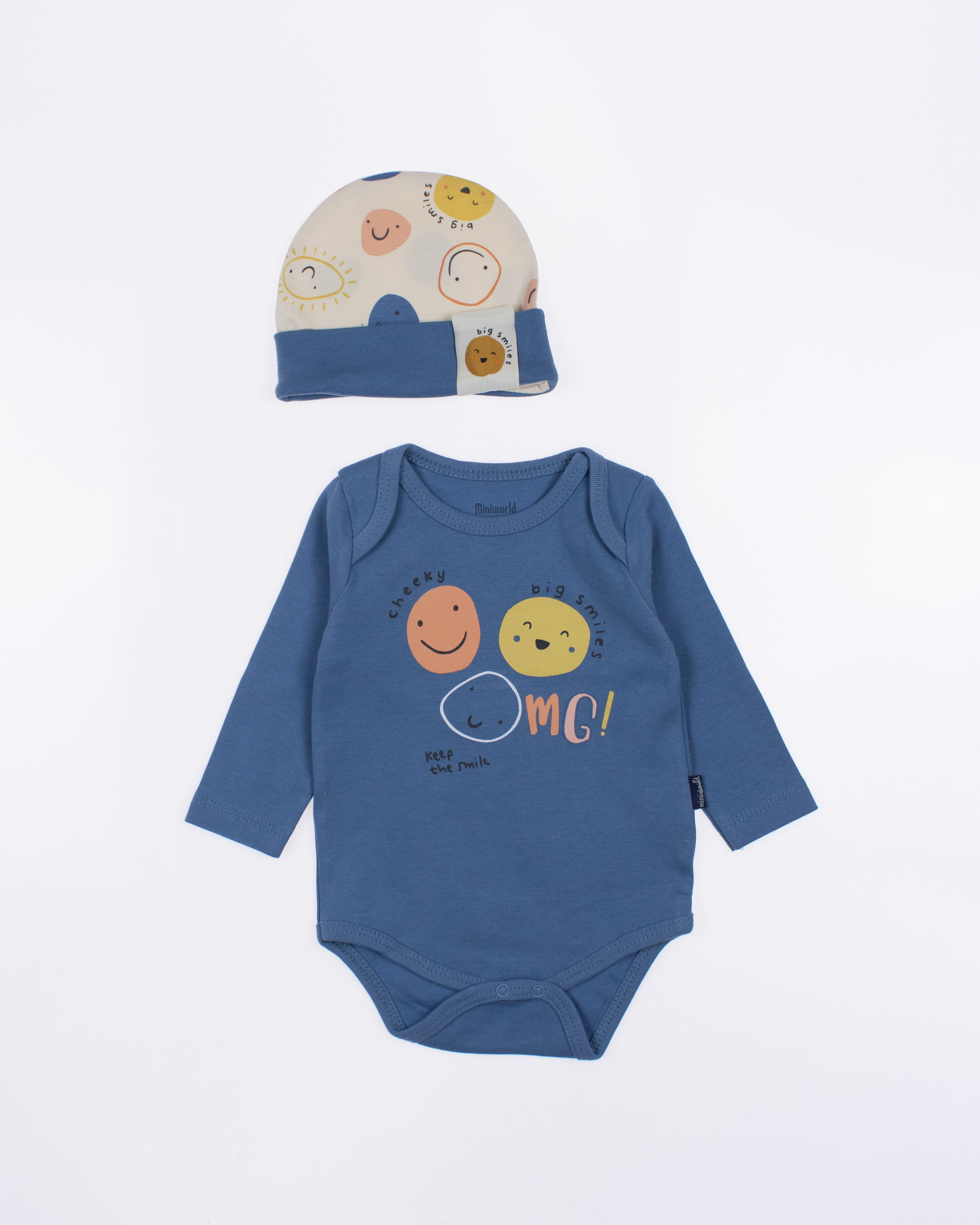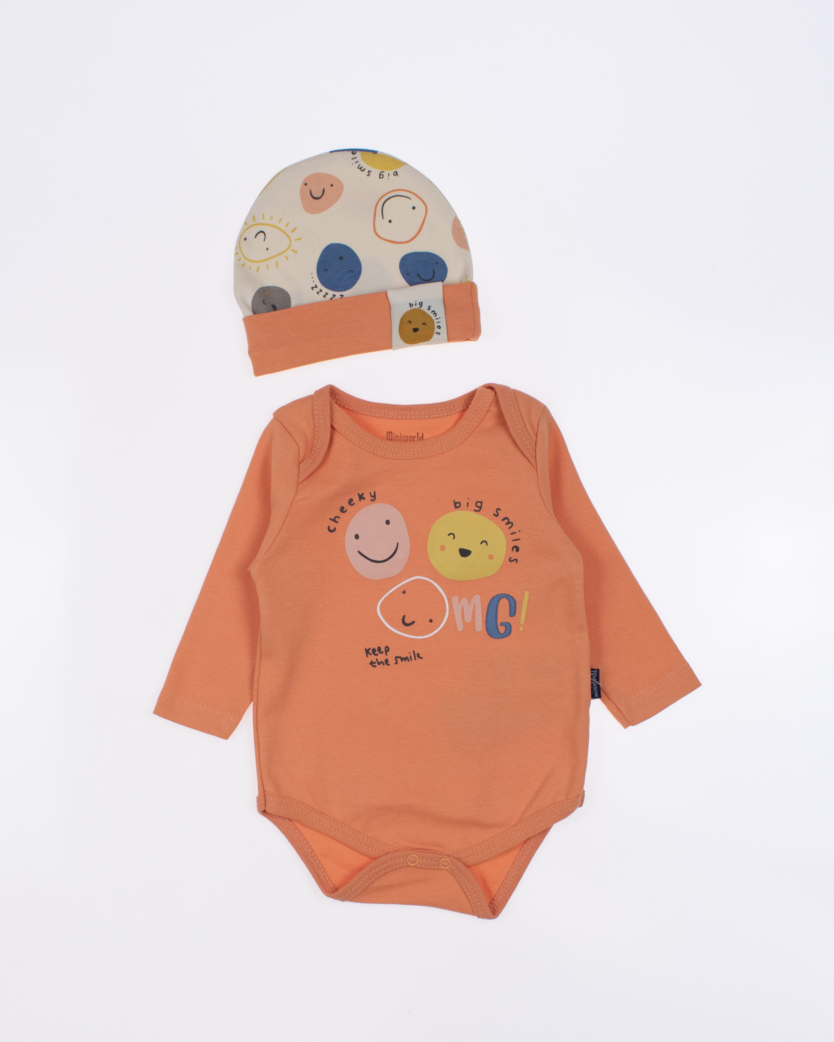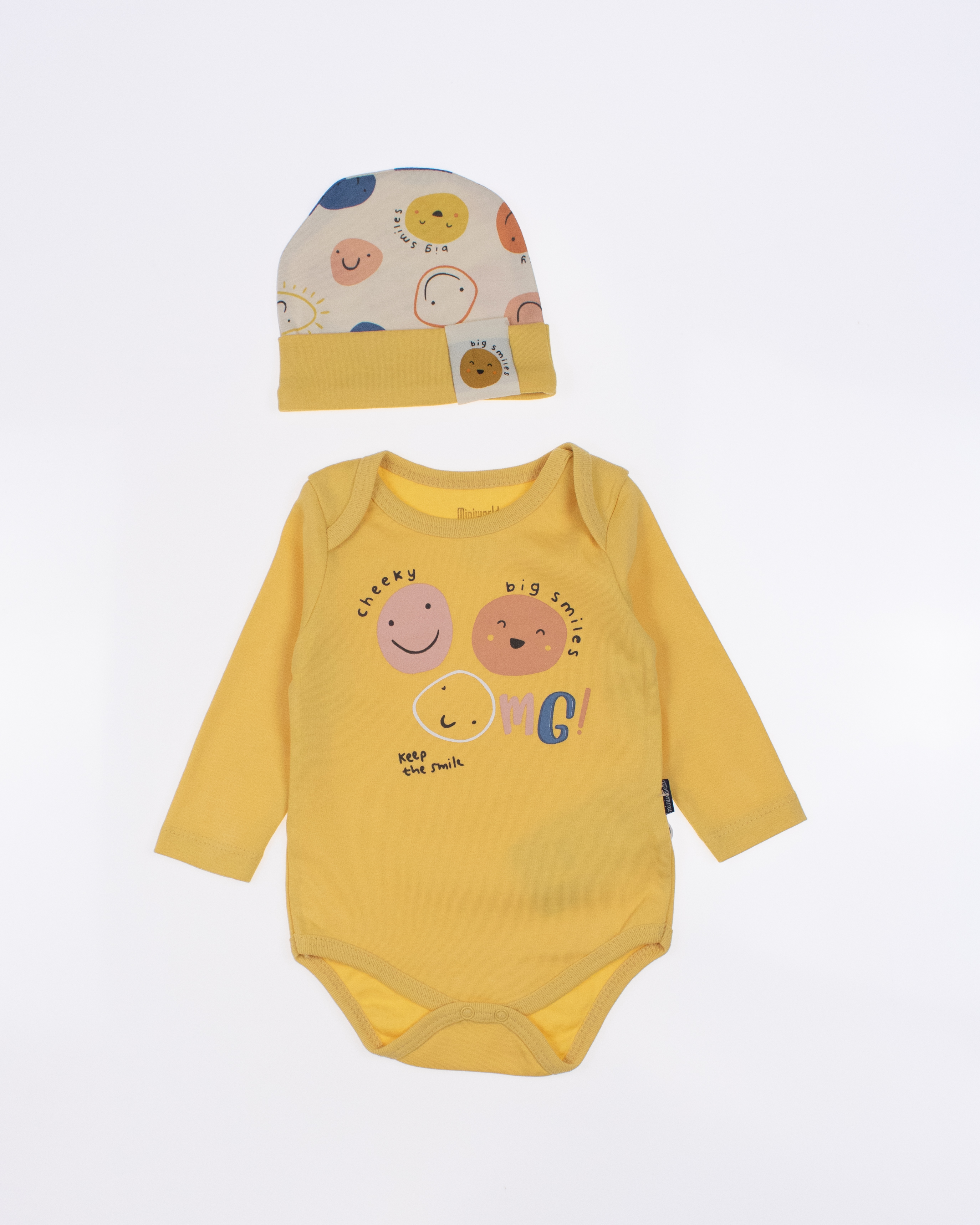 Детский боди MINIWORLD с длинным рукавом, штанишки и шапочка - комплект, который подойдет малышам с самых первых дней жизни. Боди для новорожденного очень удобен, снизу оснащён кнопками, благодаря которым маме будет удобно в любое время менять памперс ребенку.